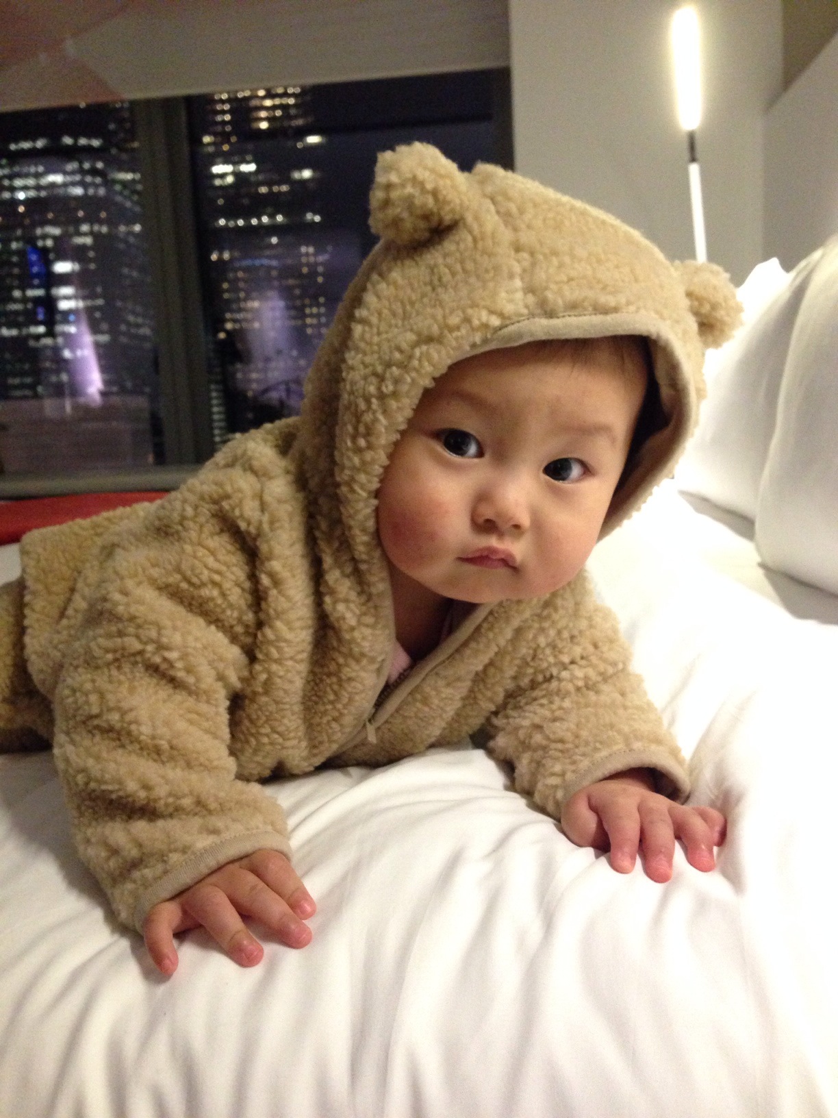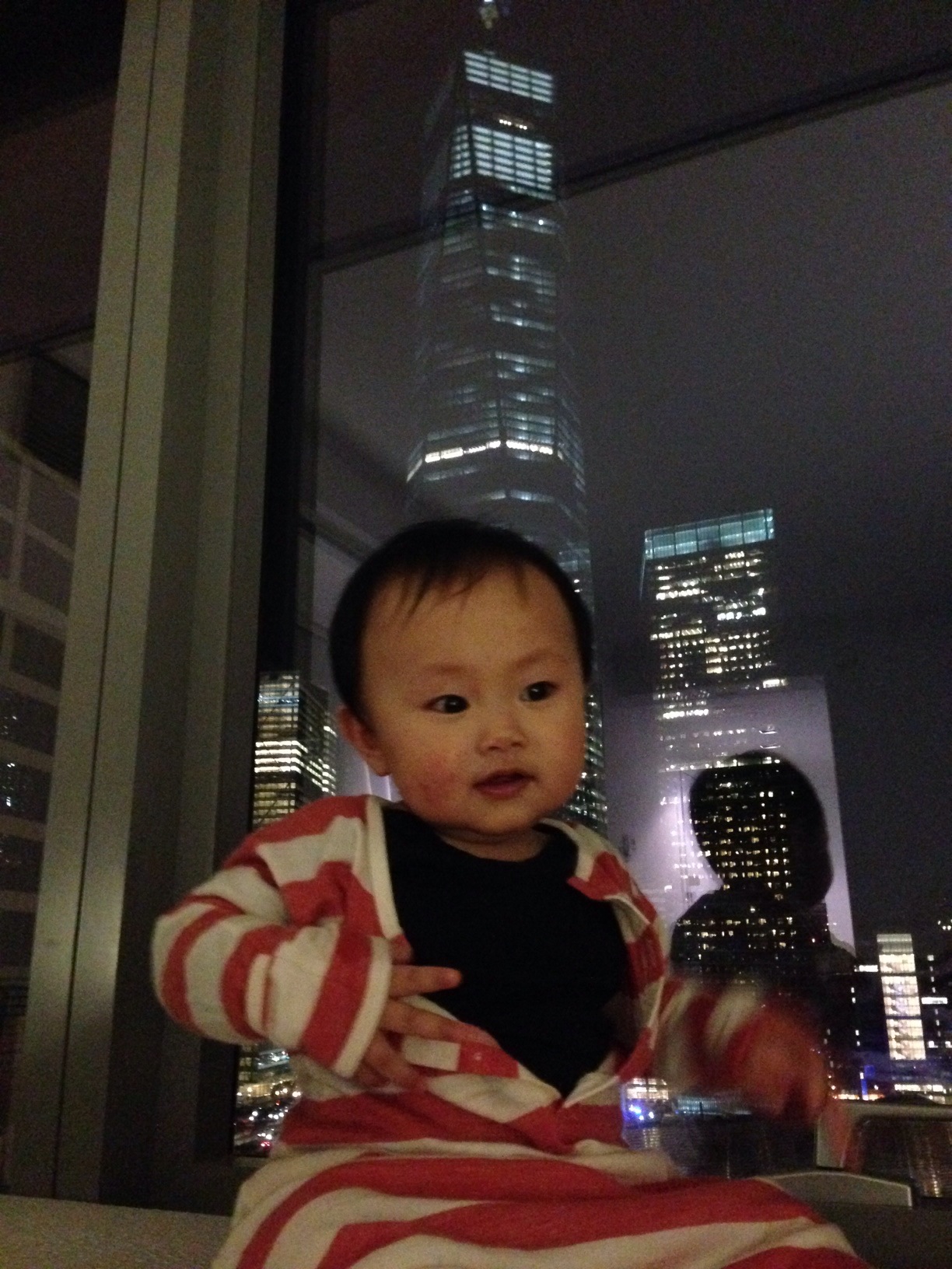 這禮拜 Chelsea 跟著媽媽從娘家回來,時差都還沒有完全調過來,週末就跟我們去紐約參加公司的年終派對。下榻的旅館在華爾街金融區裡,窗外就是世貿遺址與新世貿大樓。調皮的 Chelsea 一到房間就開始手舞足蹈起來。
