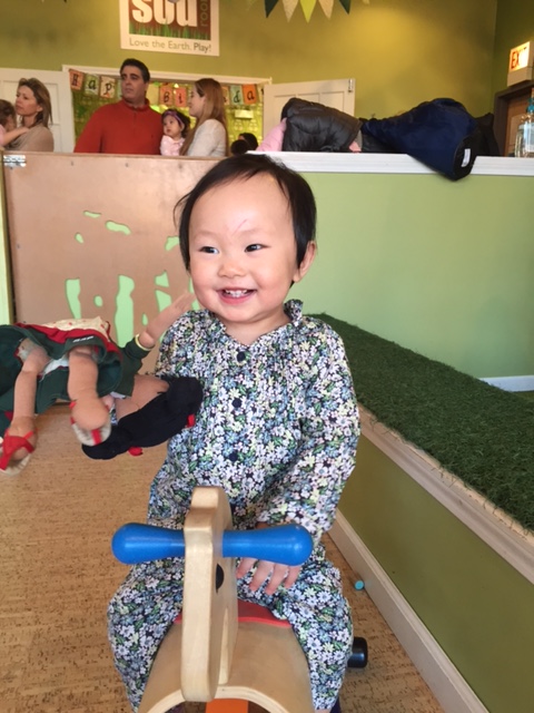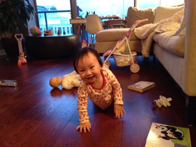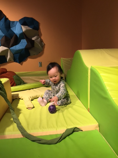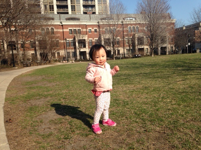 坐了一路車的 Chelsea,迫不及待地爬到草地上玩。