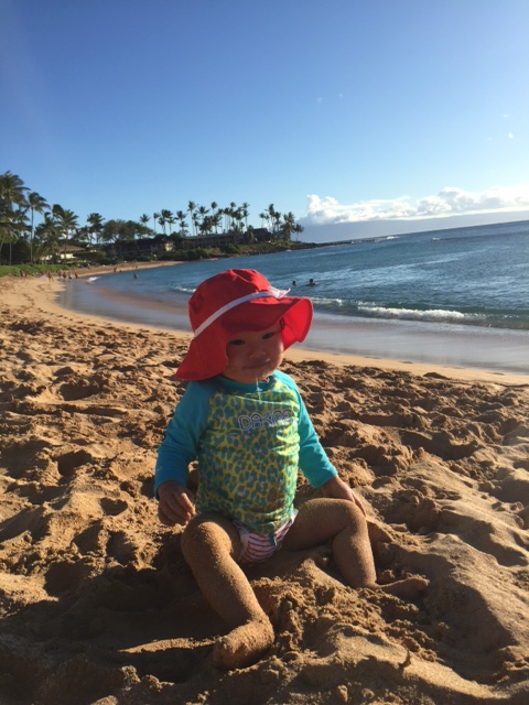 路的另一頭通往一片火山灰層積而成的黑沙灘,愛玩水玩沙的 Chelsea 馬上寬衣解帶玩了起來 XD