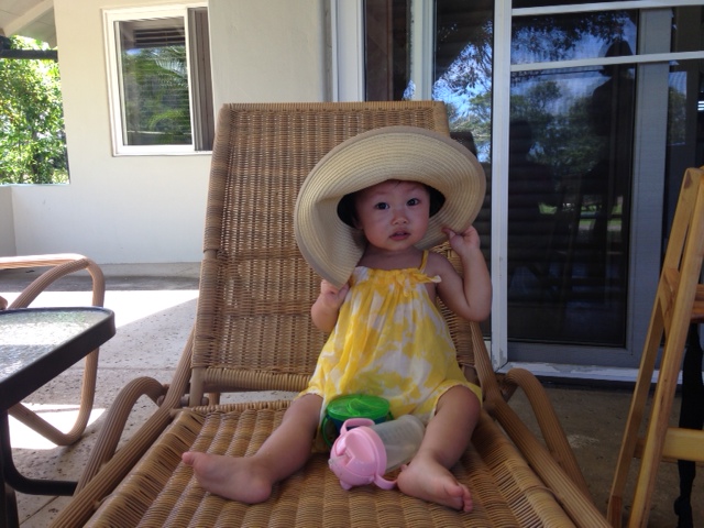 玩累了,頑皮地帶著媽媽的草帽在院子乘涼。