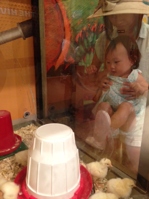我們只好帶著 Chelsea,看看一些比較小的動物。看見體型比自己小很多的小雞,Chelsea 興奮的踢著玻璃想進去玩。