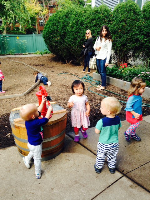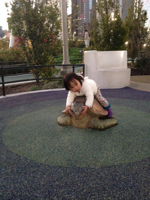 臨走前,不忘到戲水區溜達溜達。由於天氣涼了,噴水系統中止,Chelsea 只能抱著海龜雕像過過乾癮了。