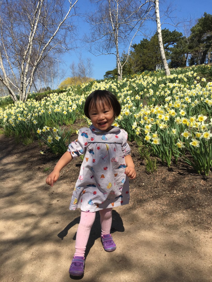 走著走著,看到了一叢盛開的水仙花,Chelsea 也跟著高興地心花怒放。