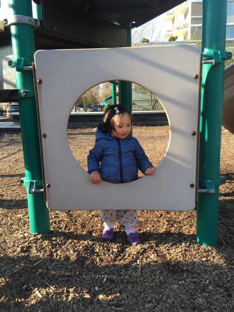 接著,來到一個兒童遊戲場玩,Chelsea 玩著玩著還不忘擺 pose 拍照。