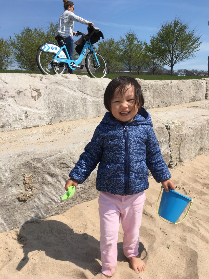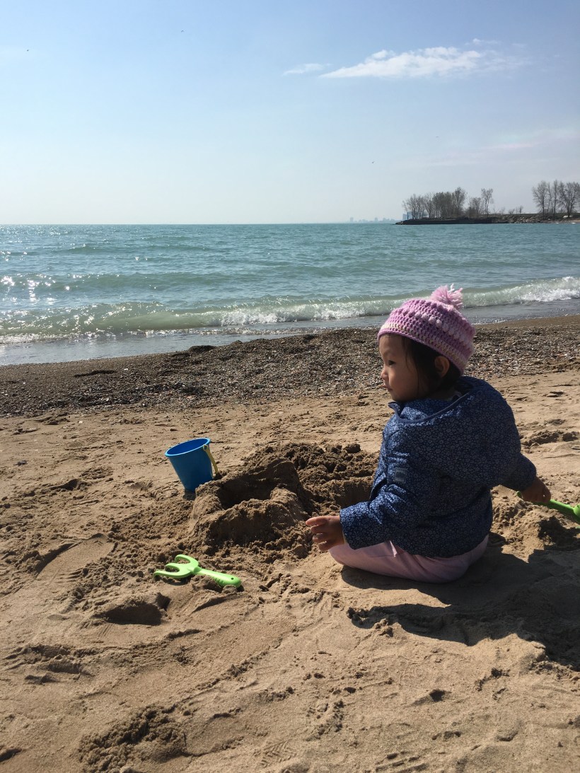 最後,我們到了湖邊的小沙灘玩,Chelsea 堆沙子堆得很專心。