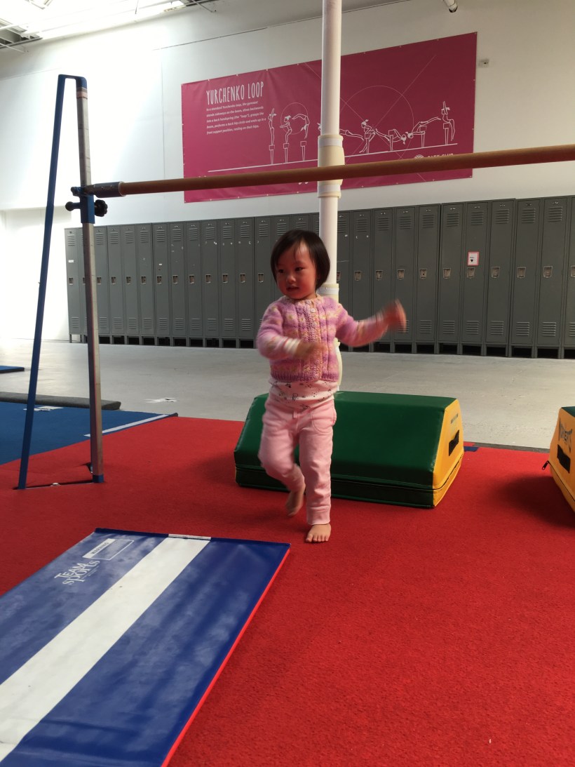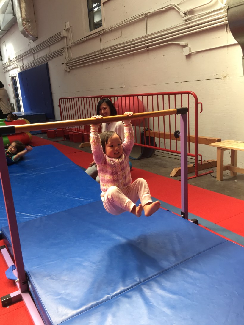 生日派對在一個小孩體操館裡舉行,現場有許多小孩子的體操訓練項目讓來參加的小朋友們練習。Chelsea 對單槓相當有心得。