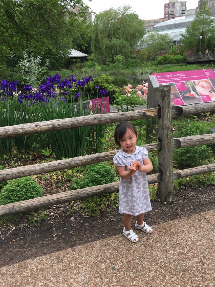 這週末,又是個艷陽高照的好天氣。Chelsea 一大早就出發到林肯公園動物園玩,今天來看的是紅鶴,Chelsea 調皮地一直想爬進欄杆裡。