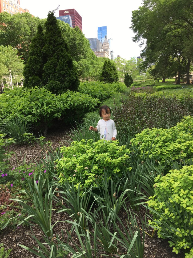 隔天早上,Chelsea 跟著我們散步去上游泳課,經過密西根大道旁的花園,頑皮地說要玩捉迷藏。