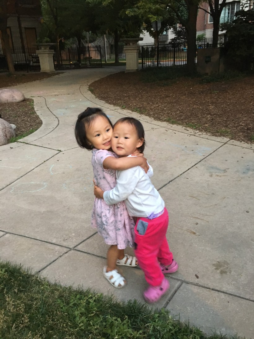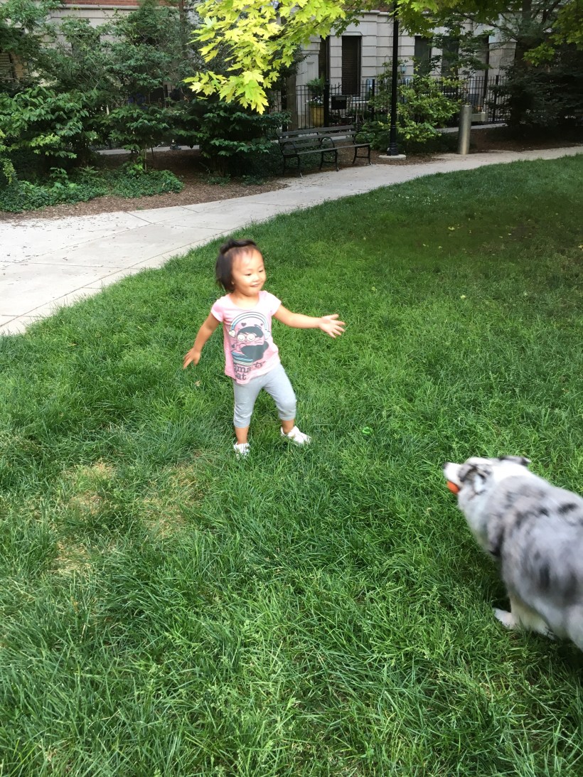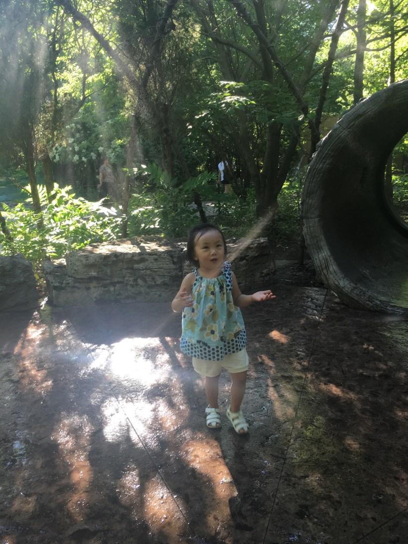 在動物園裡走著走著,到了一片小樹林,Chelsea 發現了一個灑水器,馬上開心地玩了起來。