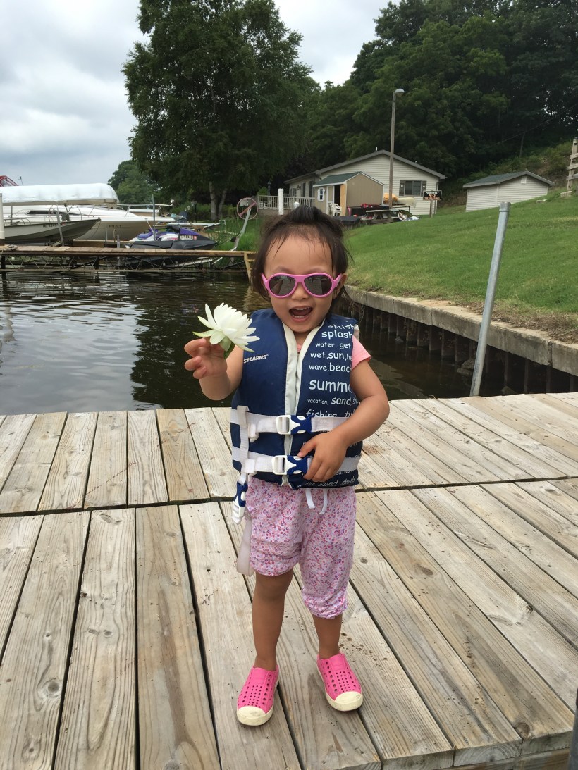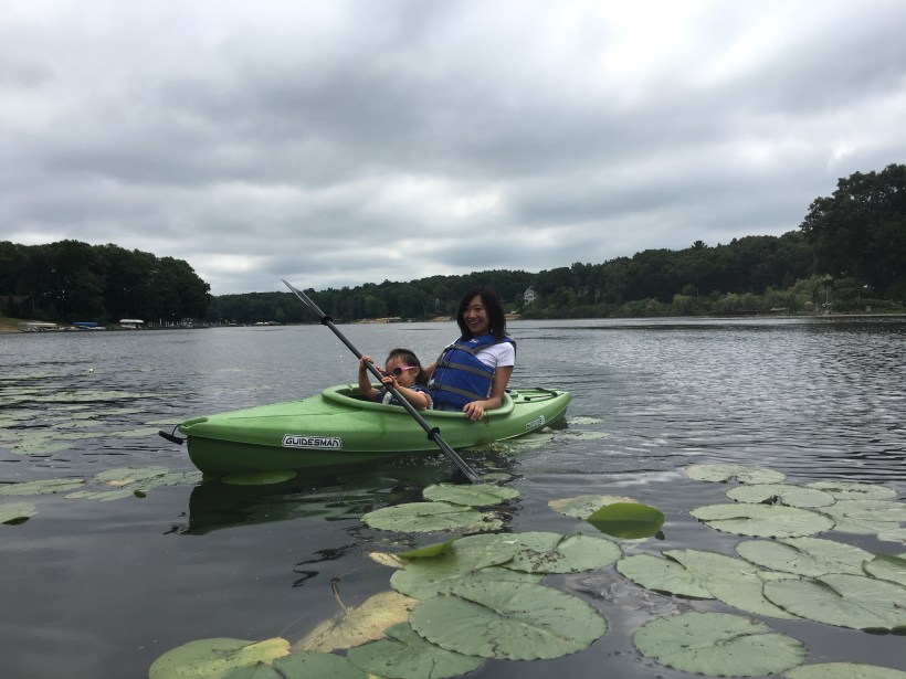 Chelsea 跟媽媽划到一片蓮花池,愛幫忙的 Chelsea 也拿著槳划。