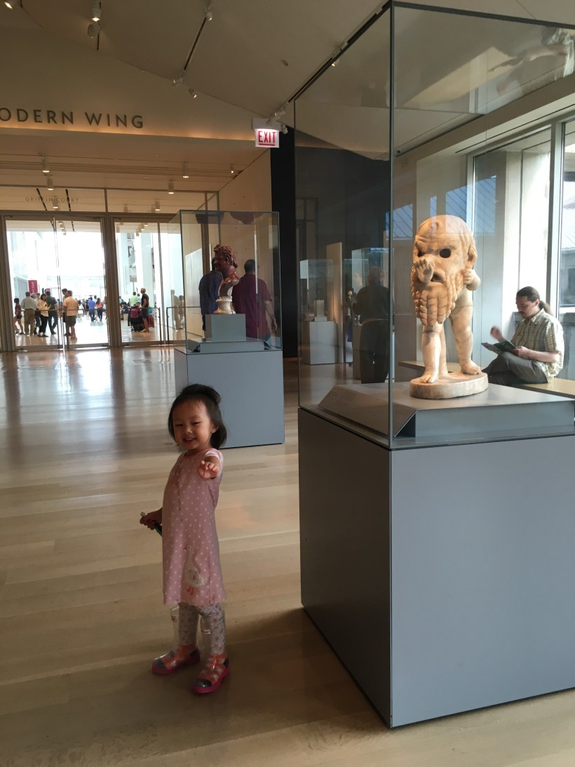 離開前,Chelsea 特別來看看她最喜歡的雕塑 – 戴面具的人,這個文藝復興時期義大利的作品,題材相當獨特幽默,Chelsea 也跟著開心地比劃比劃。