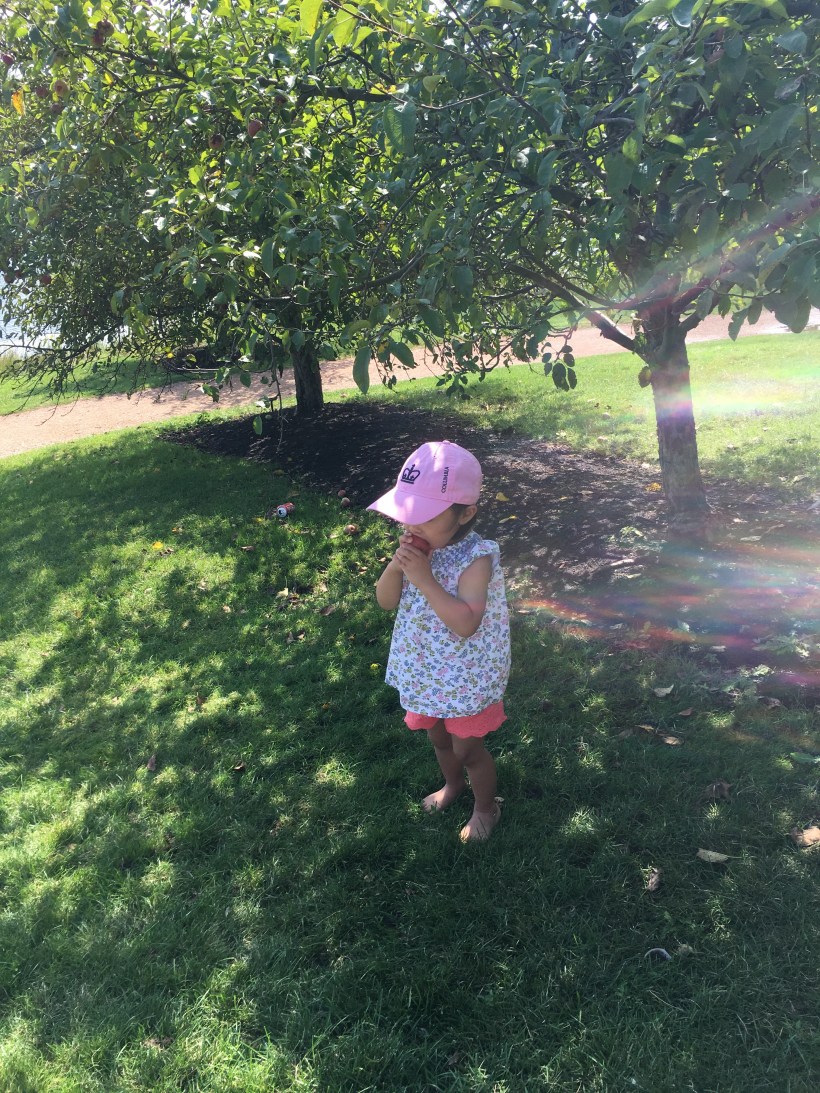 夏末初秋是芝加哥蘋果成熟的時節,植物園裡的蘋果樹叢也結實累累,Chelsea 興奮地來採收品嚐。