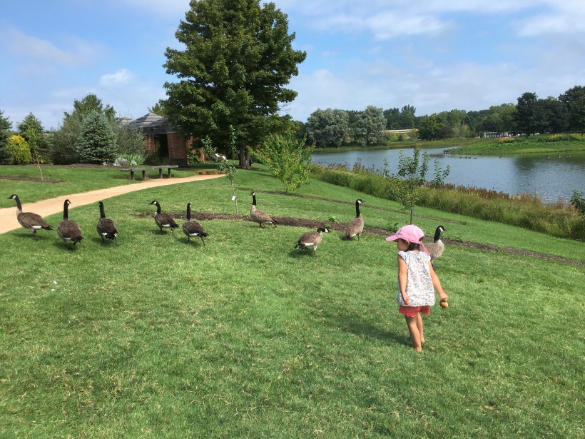 看得一旁經過的大雁也口水直流,Chelsea 趕緊來餵餵它們吃蘋果,大雁們不識 Chelsea 的好意到處逃跑,讓 Chelsea 追逐地相當可愛。