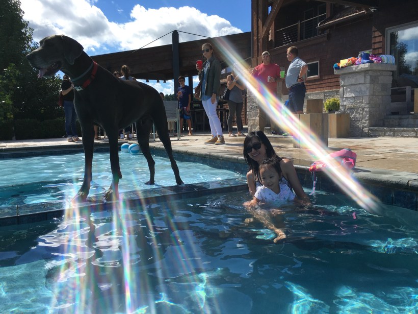 這週末,公司在大老闆的別墅舉辦夏末Party,Chelsea 也受邀來參加。別墅裡有許多遊樂設施,Chelsea 最喜歡在泳池裡游泳玩水。一隻像小馬ㄧ樣大的獵犬在ㄧ旁,像警衛搬巡視小孩子們的戲水安全,Chelsea 很想跟大狗玩,卻又有點害怕。