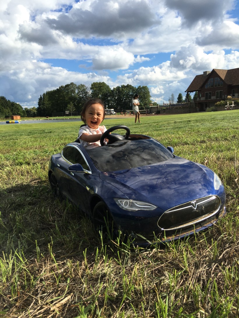 玩完水,Chelsea 在院子裡發現一台玩具電動車,一直想自己開車的 Chelsea,總算能一圓夢想。經過一番練習,Chelsea 駕車在草地上馳騁,相當拉風。