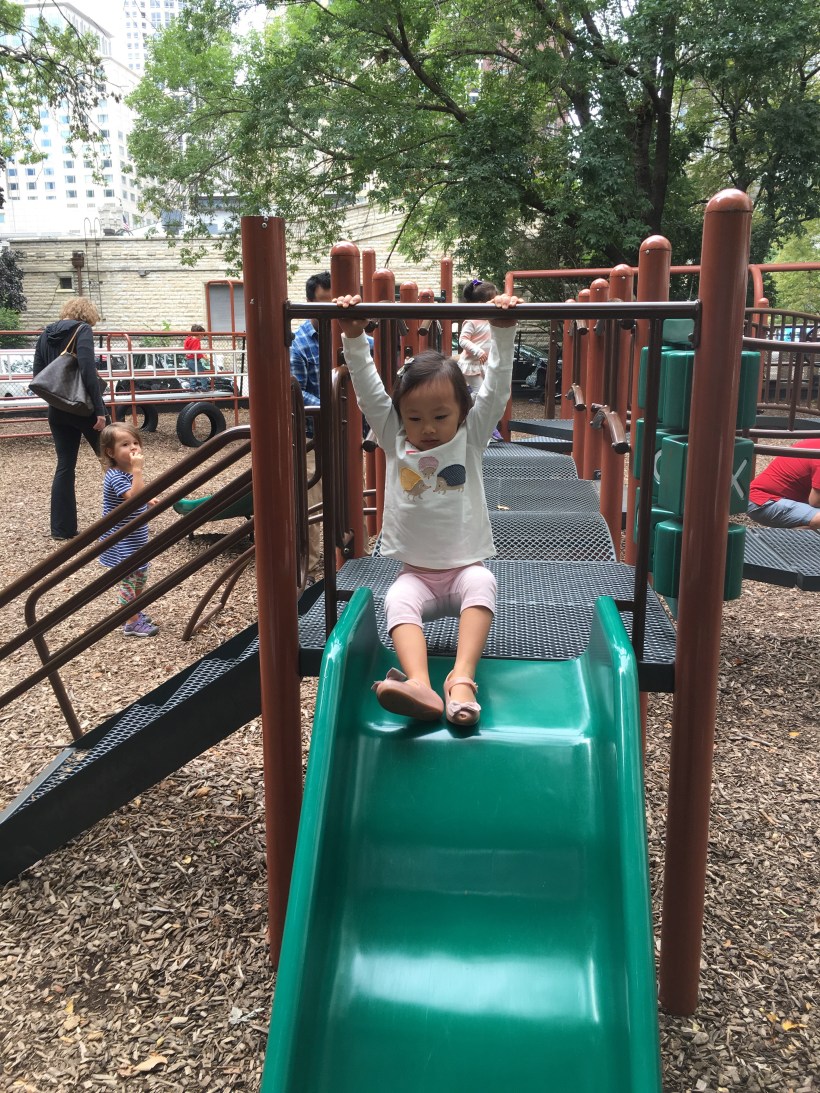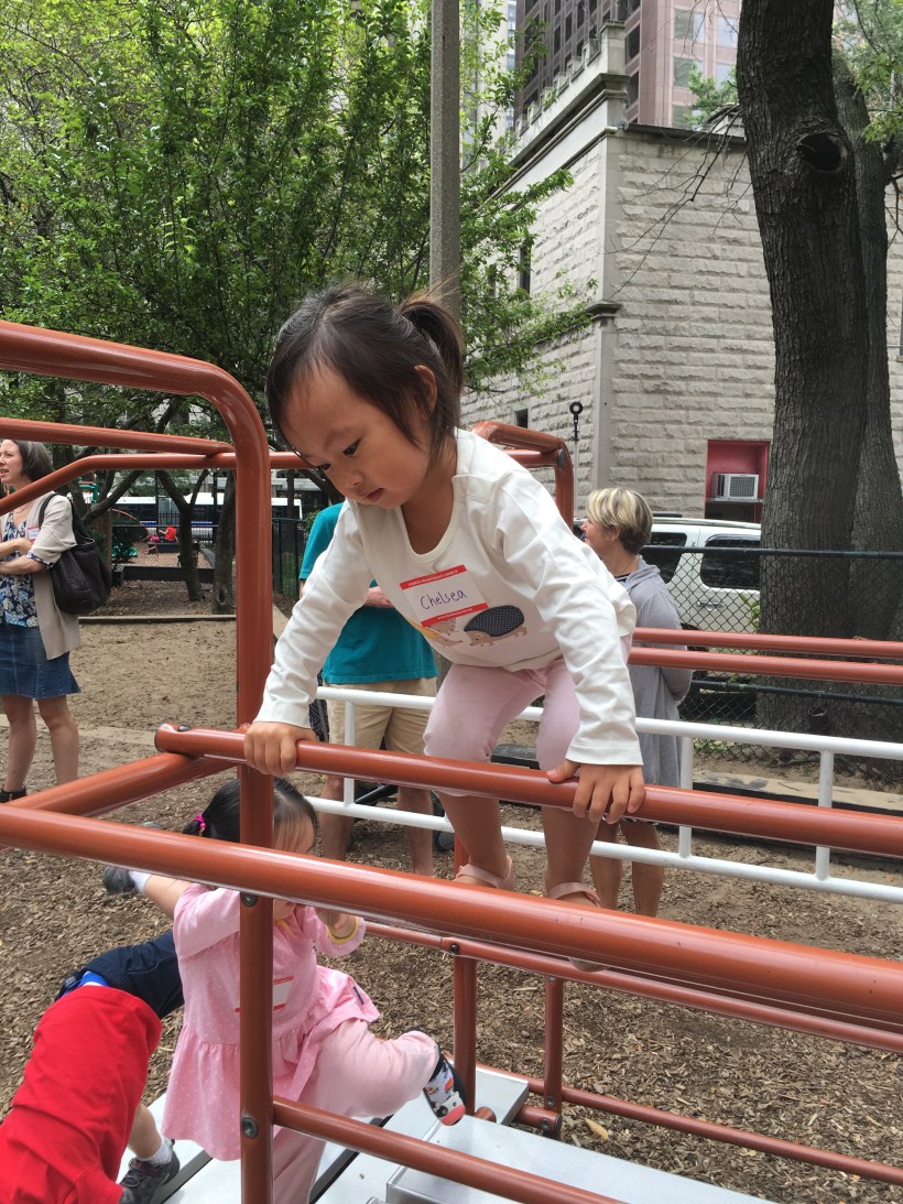 Chelsea 也開心地跟著大夥爬上爬下。遛滑梯時,還不忘吊吊單槓,非常得意。