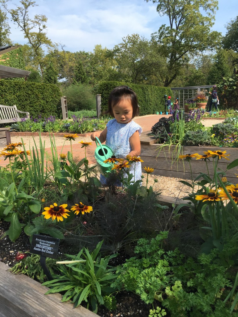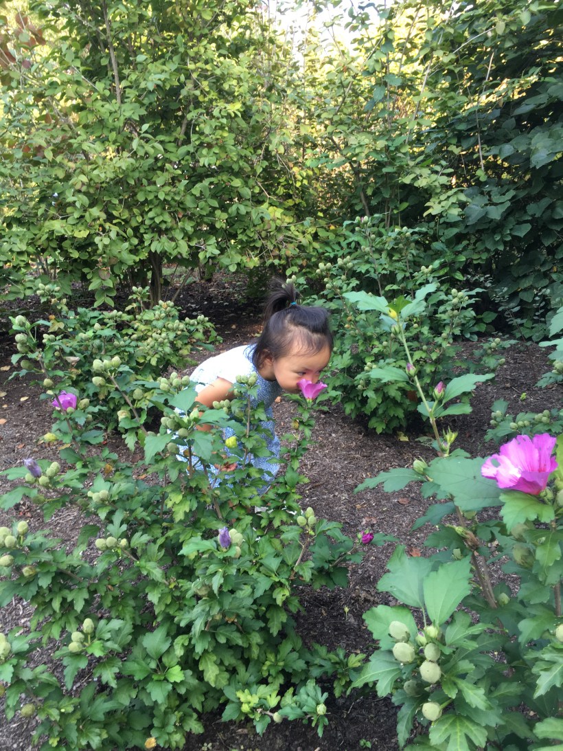 隔天是個晴朗的好天氣,趁著秋高氣爽,Chelsea 跟我們到植物園來賞花,一個不留神,Chelsea 已經在花叢裡聞香了。
