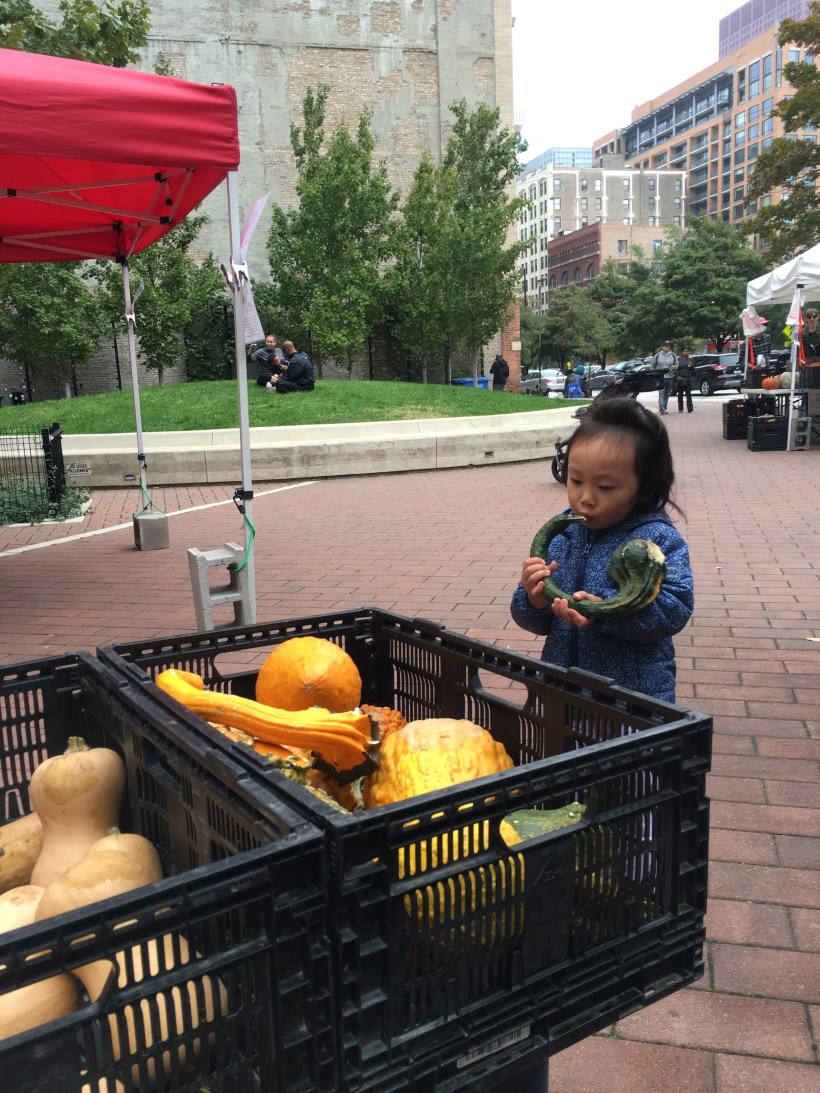這週末一早,我們帶著 Chelsea 散步到家附近的農民市集買菜。十月是南瓜的季節,市集上大大小小的南瓜,琳琅滿目,Chelsea 則頑皮地拿起一顆長條狀的南瓜當喇叭吹。