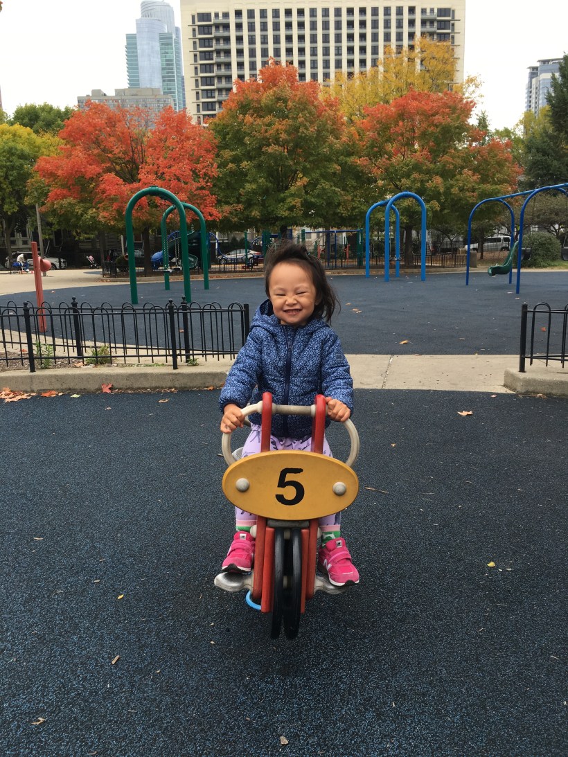 回家的路上,經過一個小公園,Chelsea 很興奮地騎著搖搖馬,搖來晃去。公園裡紅了葉的楓樹,更增添幾分秋意。