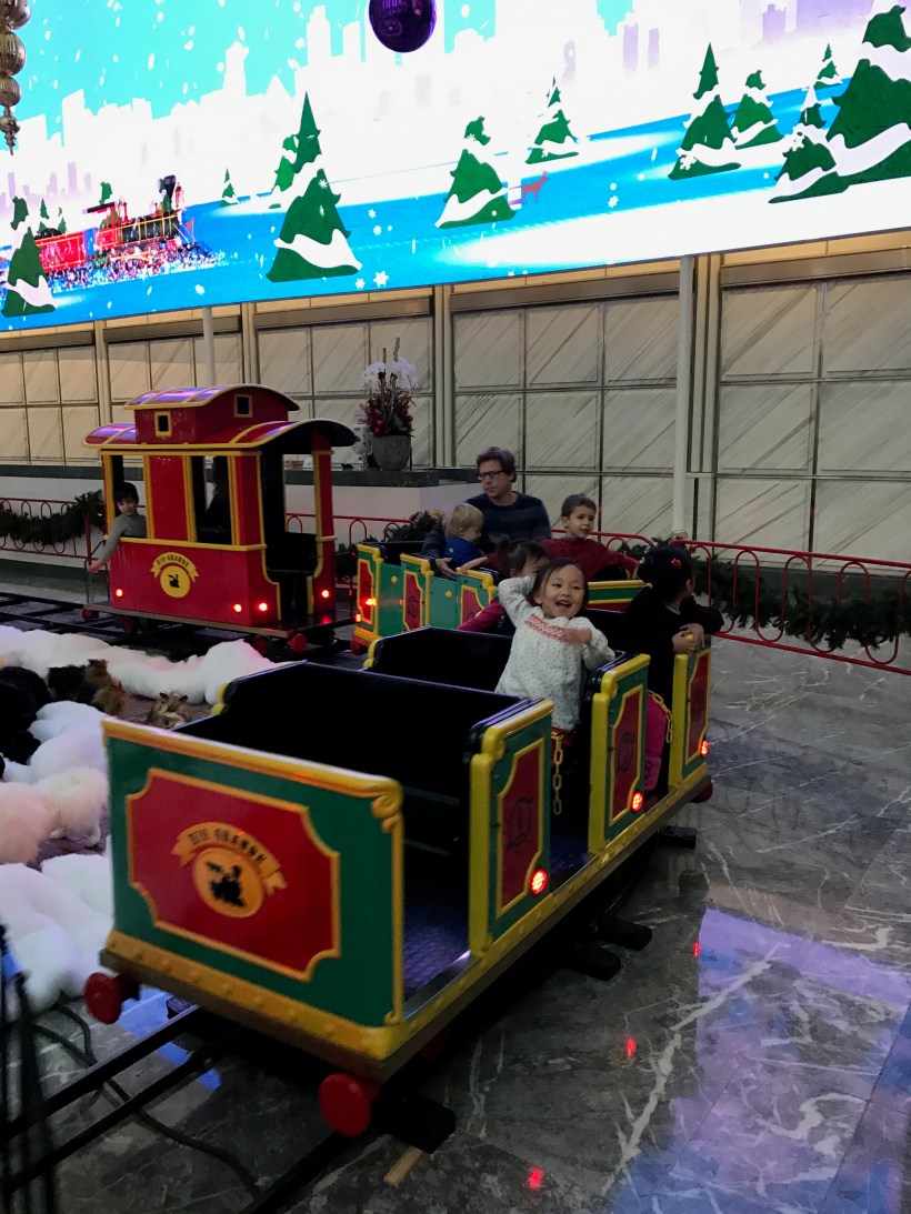 十二月也是美國人過年休假的開始,每年這個時候,公司大樓大廳都會架設聖誕小火車讓小孩子們來玩,Chelsea 自然也不能錯過。第三年來坐小火車的 Chelsea,已經玩得得心應手,甚至不要我們陪著一起坐。