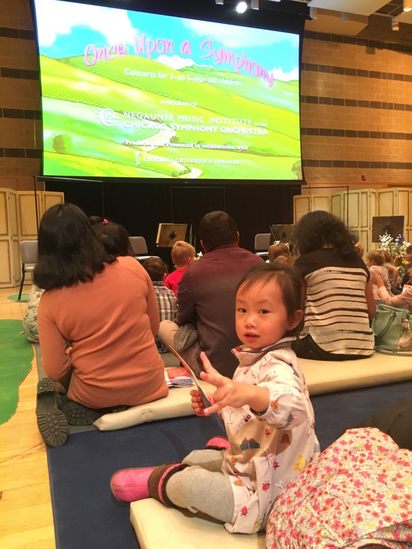 周末一早,我們來聽芝加哥交響樂團為小孩子編排的三隻小豬音樂劇。演奏低音號扮演大野狼的老爺爺,深受小朋友們的喜愛。音樂會結束後,Chelsea 跟其他小孩一起圍在老爺爺身邊研究樂器低音號。