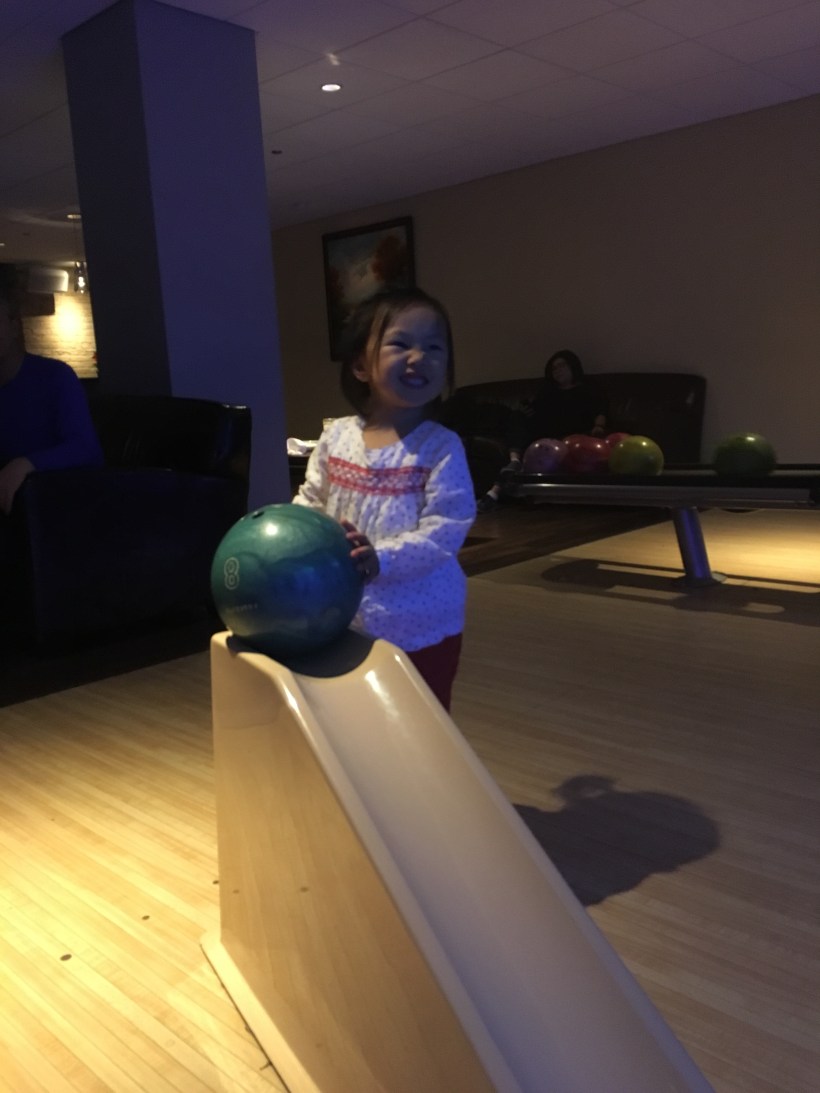 晚上,我們帶著 Chelsea 來玩保齡球。第一次玩保齡球的 Chelsea,既新奇又興奮地不停研究保齡球,在道具斜坡輔助下,Chelsea 也打得有模有樣。