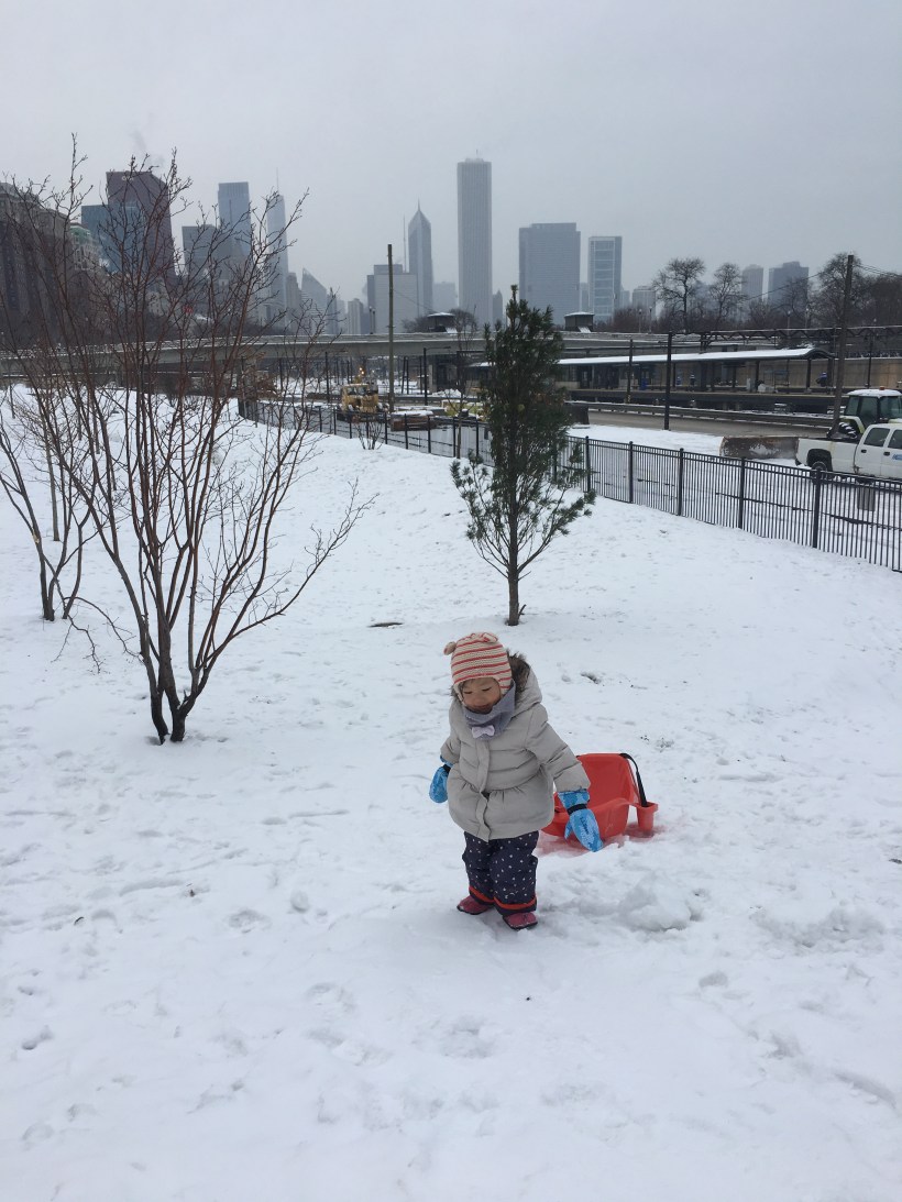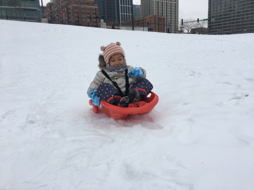 這禮拜,寒流來襲,芝加哥低溫降到零下二十度,降下的雪,堆積在路旁久久不能融化,任何的小斜坡,都成了 Chelsea 的滑雪場。