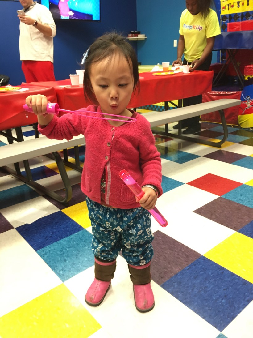派對結束,Chelsea 領到一個 goody bag,裡面裝著 Chelsea 最愛玩的吹泡泡玩具,Chelsea 迫不急待地吹著泡泡玩。