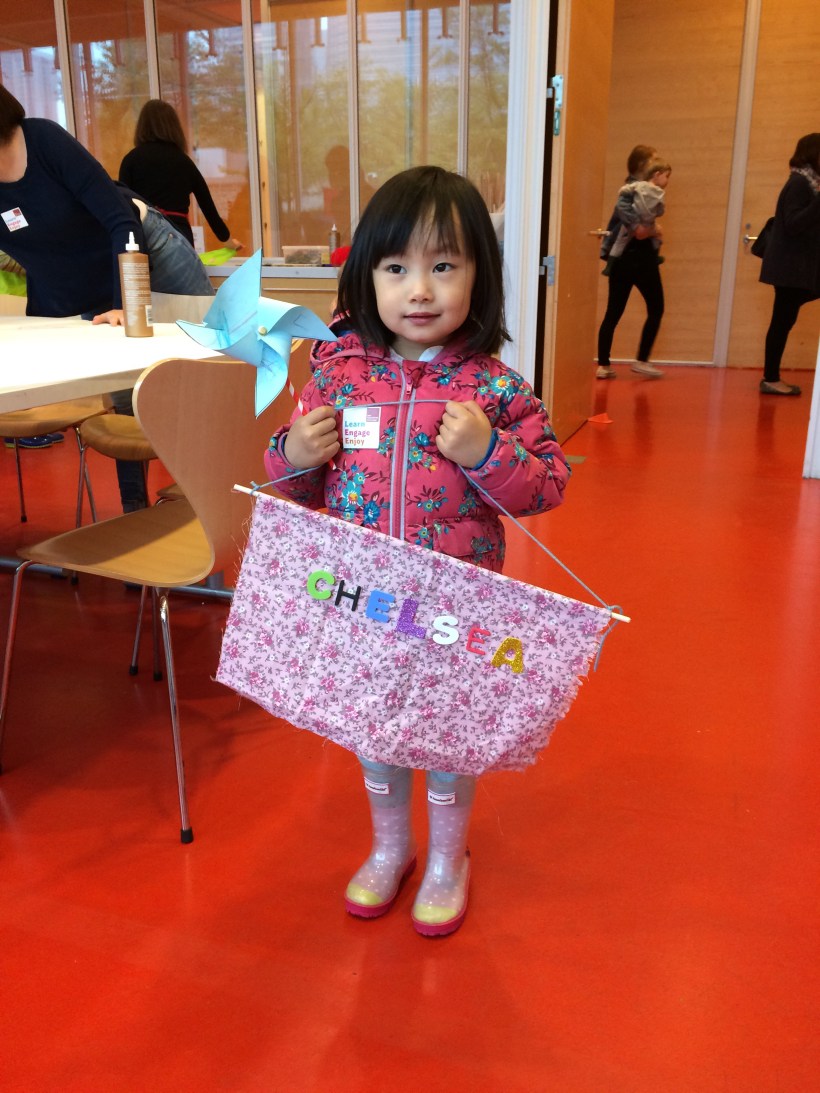 活力充沛的 Chelsea,白天總需要參加許多的活動來發洩精力。這天來到芝加哥美術館參加兒童美術勞作節,第一站來拼貼一面 Chelsea 自己專屬的旗子。