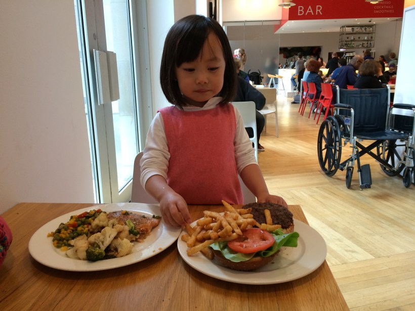 活動累了,Chelsea 在最愛的美術館附設餐廳點了最喜歡的起司漢堡與鮭魚當午餐,大快朵頤。