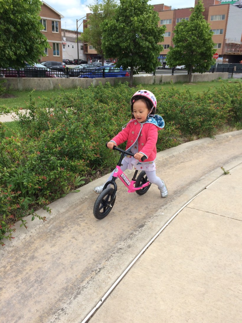 午後,趁著天氣好,Chelsea 出門練習平衡車,為騎腳踏車做準備。