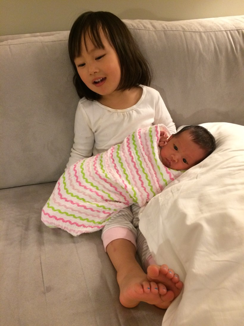 Florence 回家的第二個禮拜,Chelsea 整天都想找妹妹玩,可惜 Florence 現在只忙著喝奶睡覺,能跟 Chelsea 互動的時間有限。姐妹倆還是把握機會一起坐在沙發上來個合照。