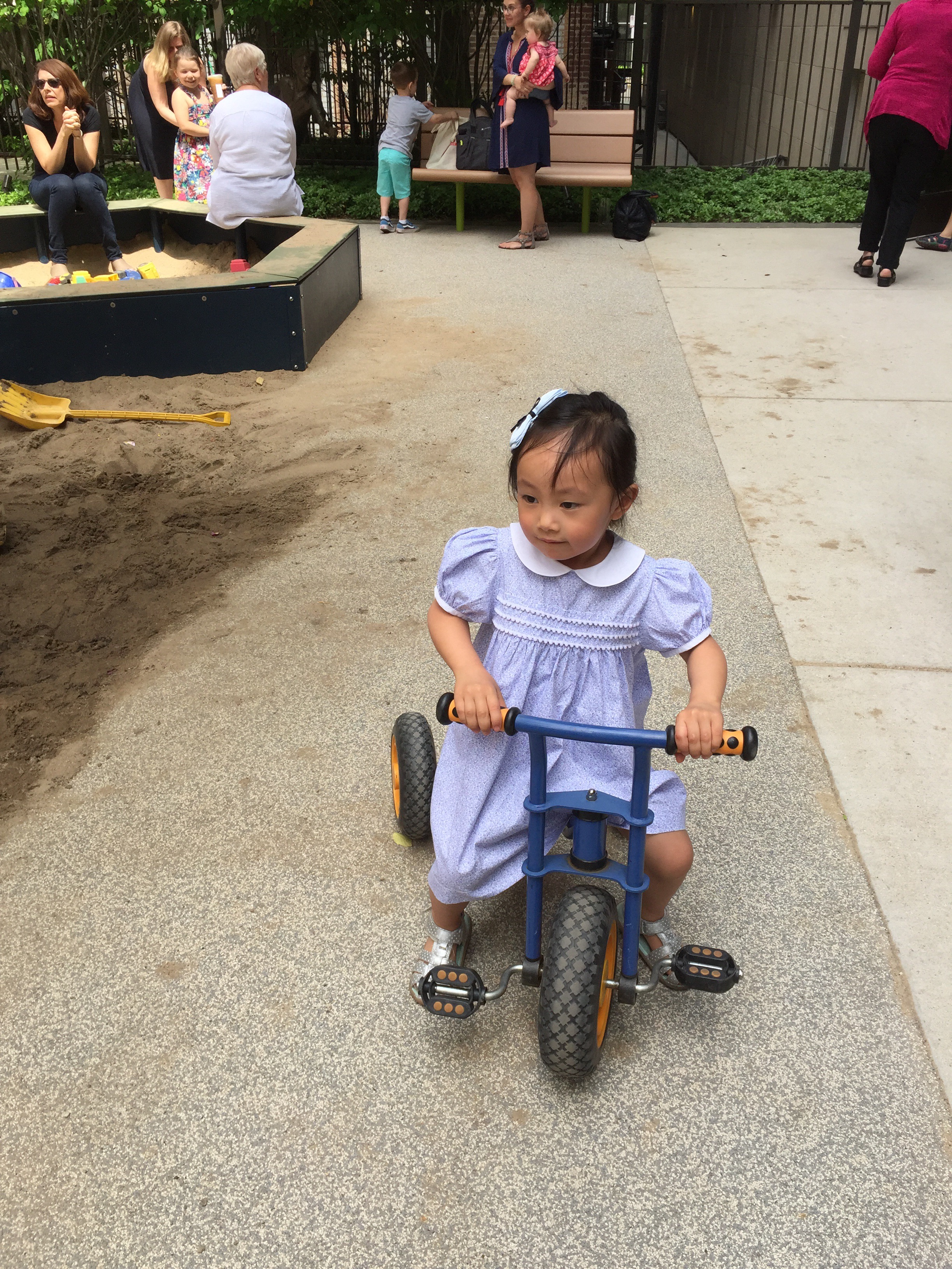 剛學會騎車的 Chelsea,這禮拜每天都到小公園練習,現在 Chelsea 能騎得越來越快,也開始試著按煞車控制速度。