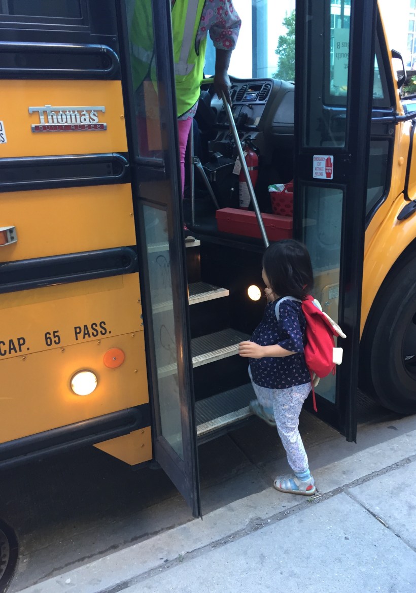 第二天一早,Chelsea 聽說有校車接送服務,馬上躍躍欲試,自己背著小書包,坐上校車上學去。