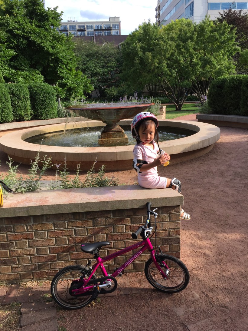 越來越會騎腳踏車的 Chelsea,最近總是騎著車在家附近到處探險,這天騎來婦女公園玩,在公園裡的噴泉旁喝果汁休息,順便乘涼玩水。