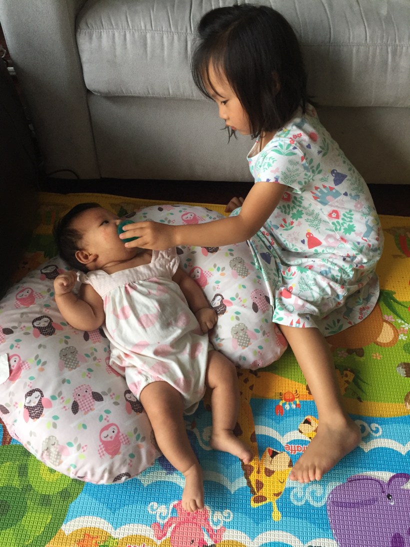 我們發現 Florence 很喜歡吸奶嘴,哭鬧的時後,總能吸吸奶嘴平靜下來,Chelsea 一發現 Florence 哭,有樣學樣地給 Florence 吸奶嘴。