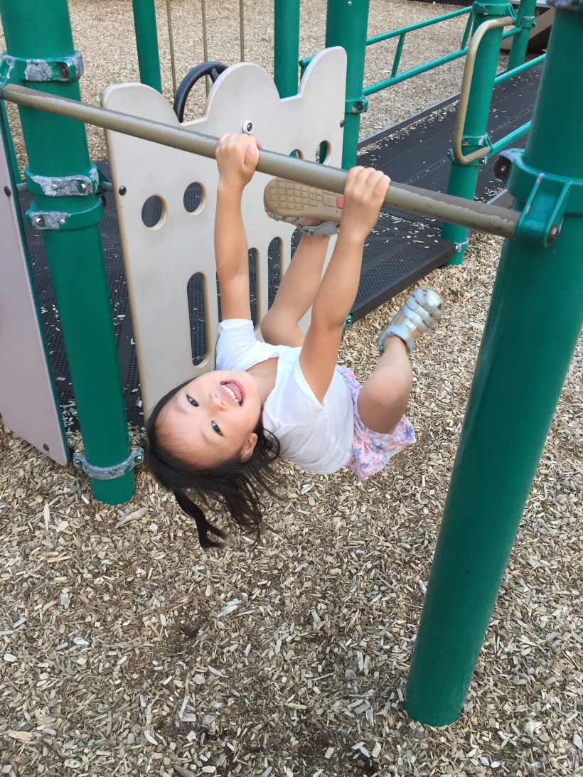 練習完腳踏車,Chelsea 在小公園裡玩,吊起最愛的單槓,手臂強壯有力。