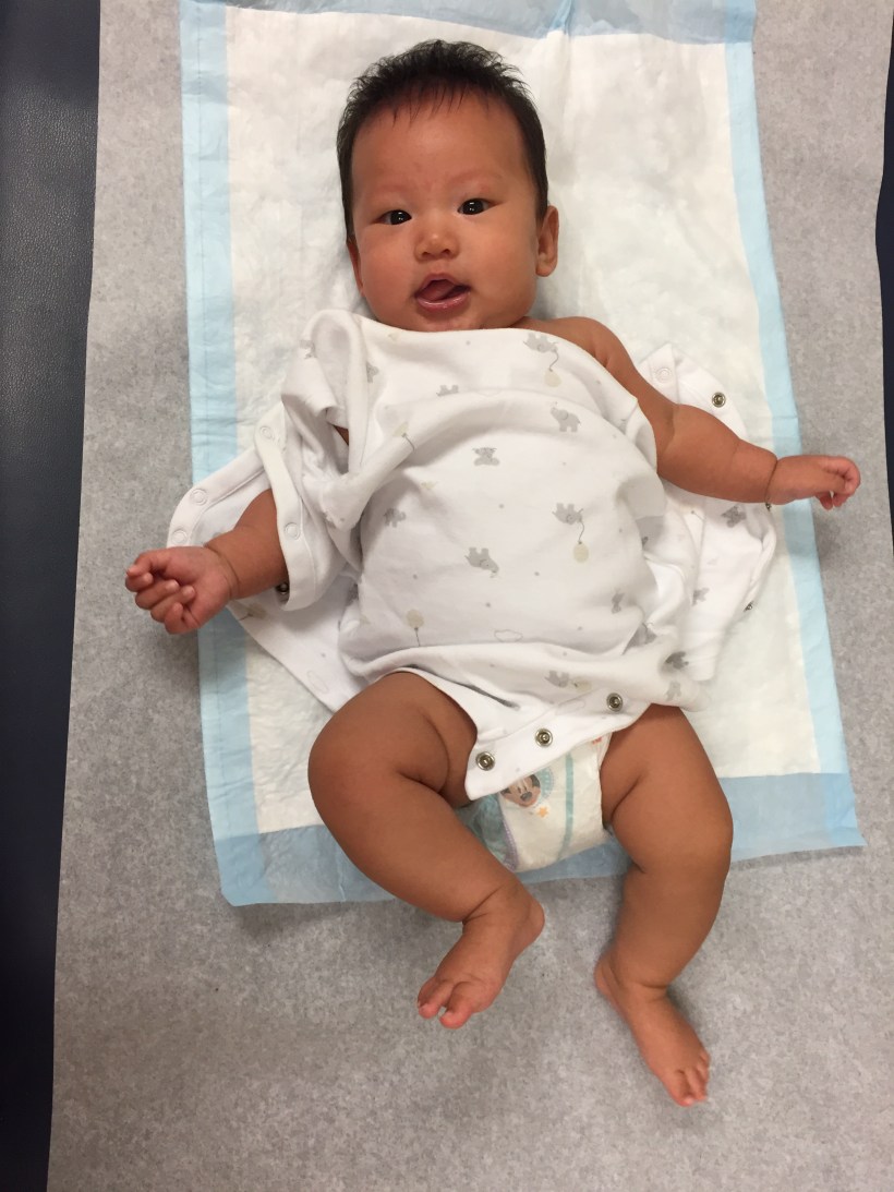 還不能跟姐姐一起騎車出去玩的 Florence,這天來做兩個月的健康檢查,各項發育指標都正常,還是一個頭好壯壯、高大的小嬰兒。
