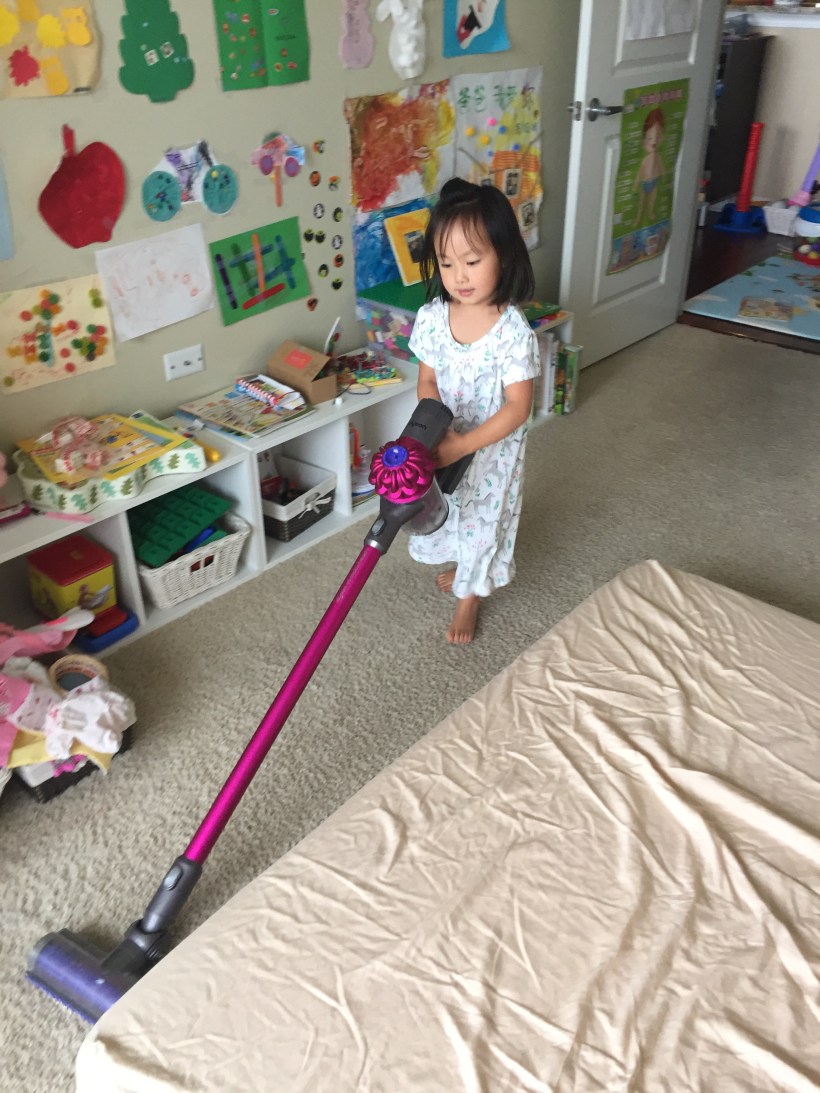 炎炎夏日裡,Chelsea 從夏令營回家休息後,喜歡幫忙做家事,這天 Chelsea 在打掃自己的房間,拿起吸塵器有模有樣地吸地。
