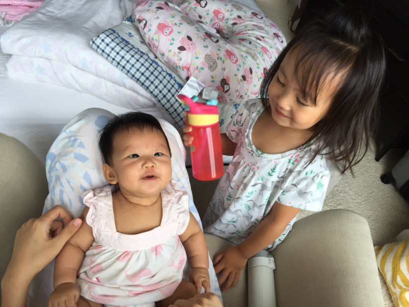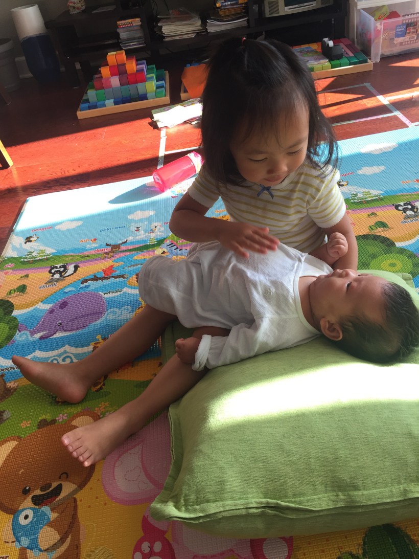 Chelsea 也喜歡幫忙照顧妹妹,這天抱著 Florence,想哄妹妹睡覺。