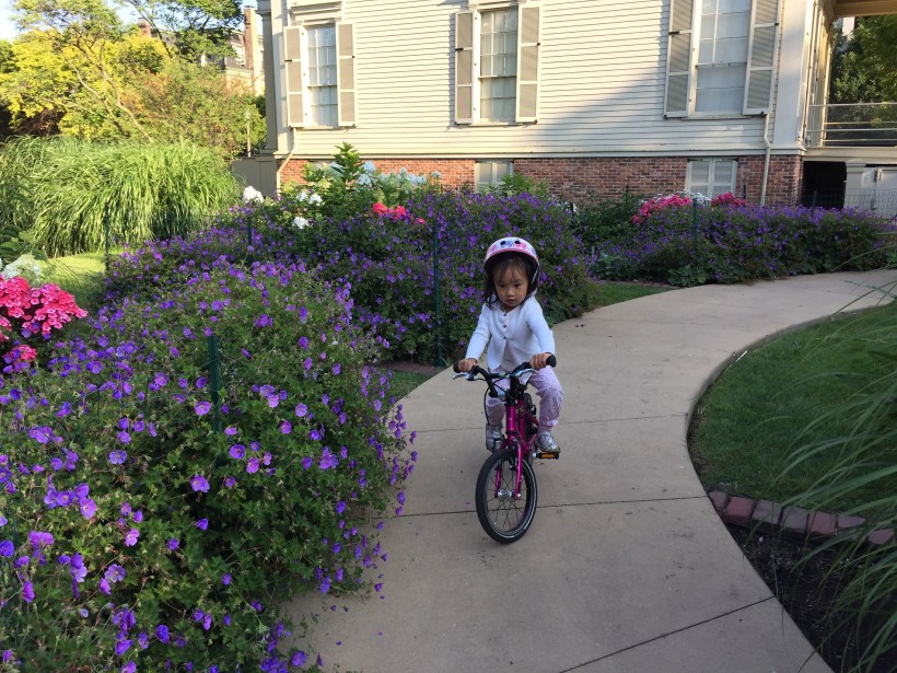 傍晚,天氣較涼爽,Chelsea 騎著車到家附近的婦女公園玩,公園裡花團錦簇,氣氛幽靜,Chelsea 玩得十分愜意。