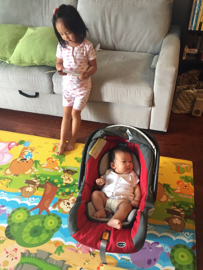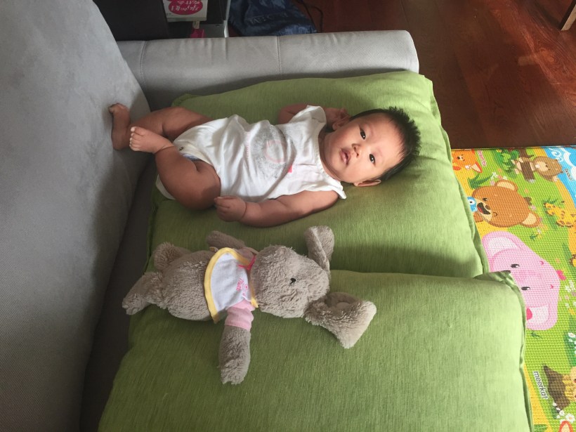 Florence 現在還聽不懂故事,只好乖乖地躺在客廳,看著姐姐 Chelsea 在家裡到處玩鬧。
