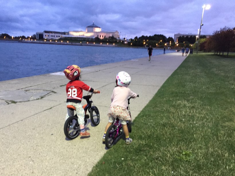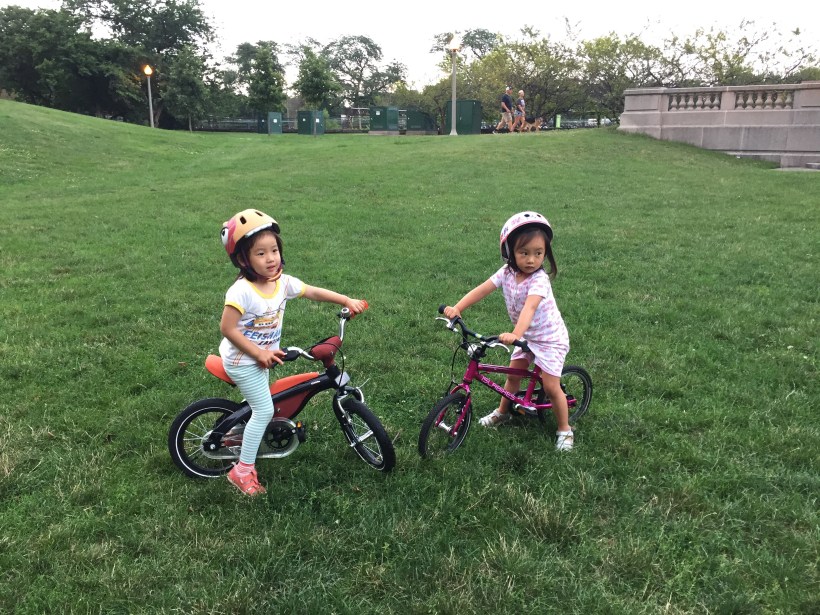 Chelsea 最近吃完晚飯,常常跟鄰居大寶一起在家附近的公園騎車,兩個人一起騎著她們的小車到處探險。