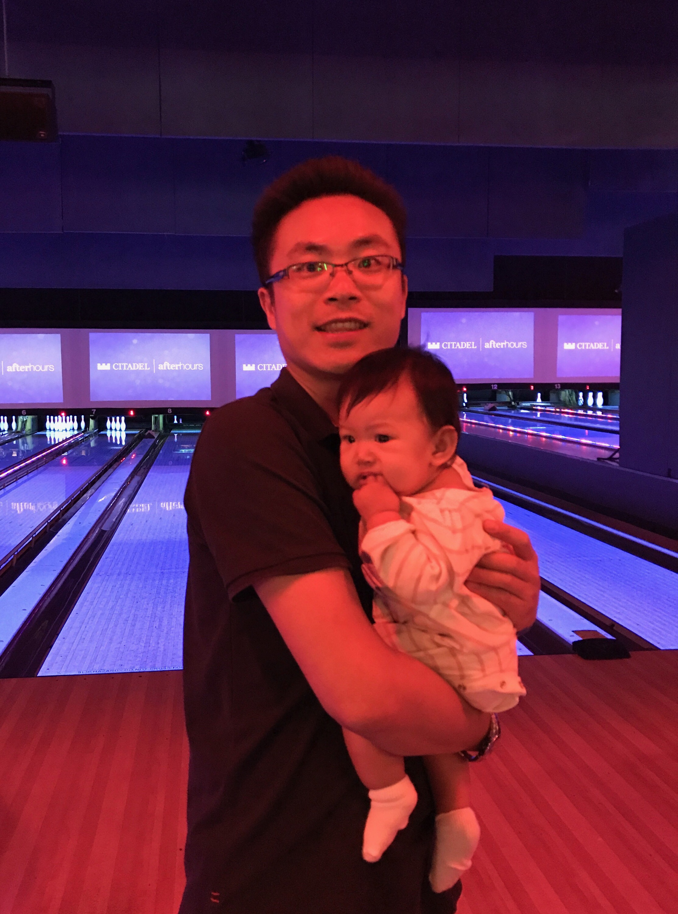 我們一到活動場地,先前往保齡球館打保齡球。好奇的 Florence 也東張西望的想參與。