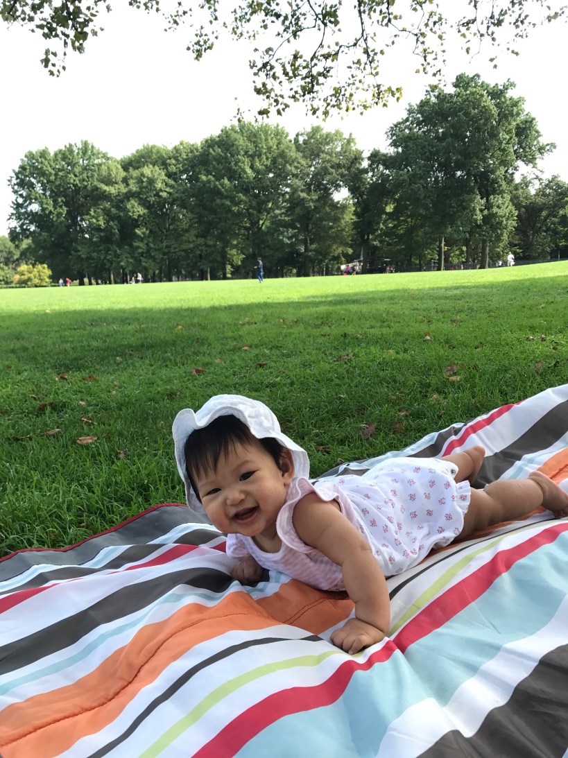 姐姐平常上學,Florence 跟著媽媽、姥爺與姥姥到中央公園踏青,四個半月大的 Florence,現在活動力越來越強,也會自己翻滾身體,自得其樂地玩。