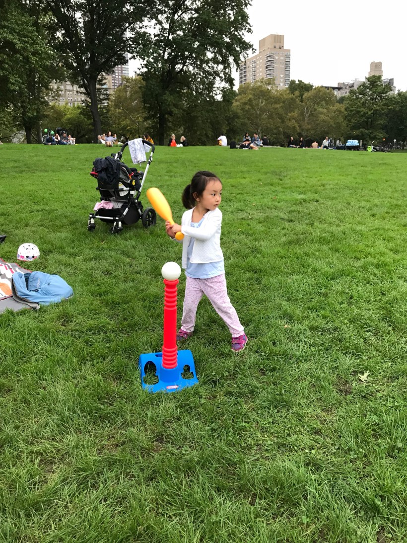週日下午,我們到中央公園的綿羊草地上玩,Chelsea 有模有樣地練習打棒球。