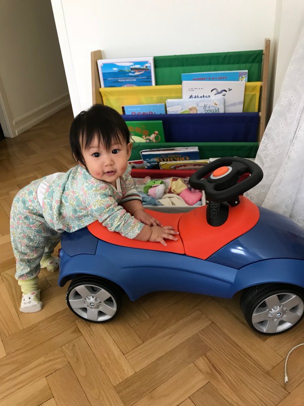Florence 則整天在姐姐的房間裡尋寶,對姐姐的各種玩具都很有興趣,尤其是這台小車,更是好奇地想學姐姐坐在車上騎著走。
