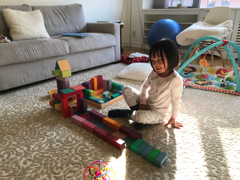這禮拜,美國東北部遭遇暴雨雪,紐約下了一天一夜的雪,Chelsea 的學校也停課一天,沒有上學的 Chelsea,在家裡堆積木蓋房子。