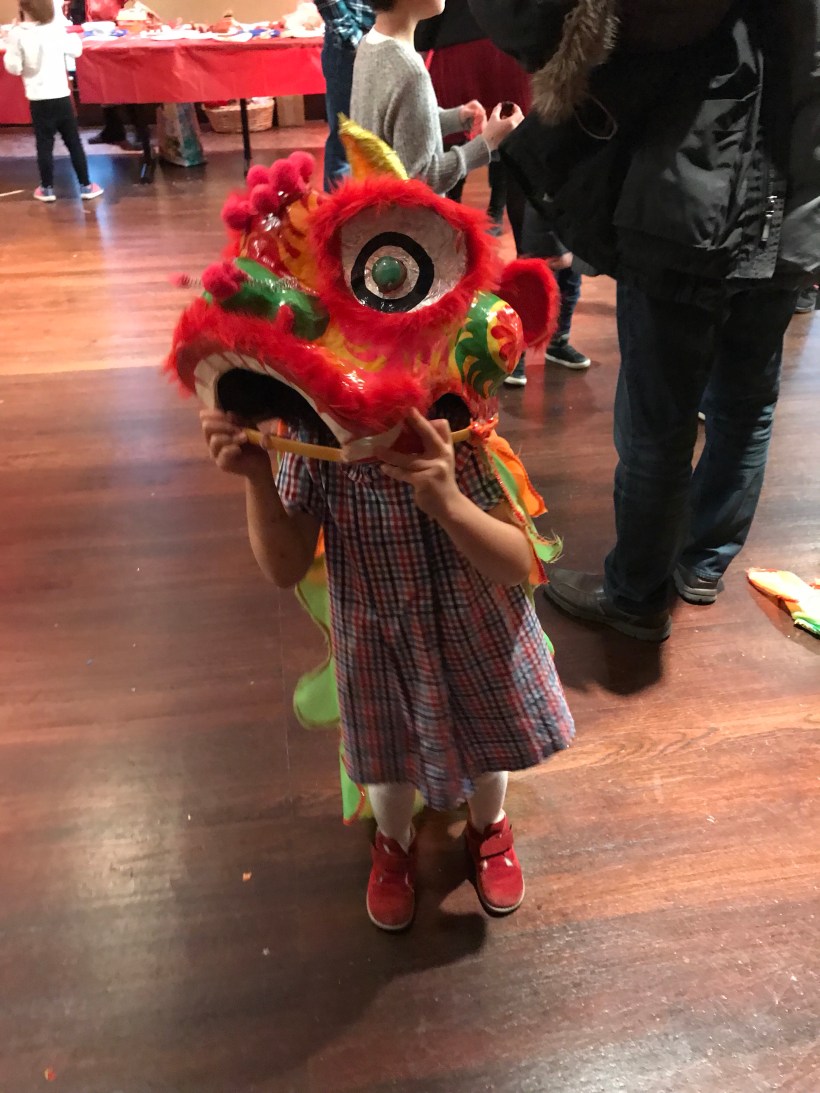 這週六是大年初二,家附近的亞洲博物館舉辦新年慶祝活動,館裡提供臉譜面具讓小孩子們彩繪創作,Chelsea 很專心的畫著臉譜,Florence 也在一旁好奇地觀看。