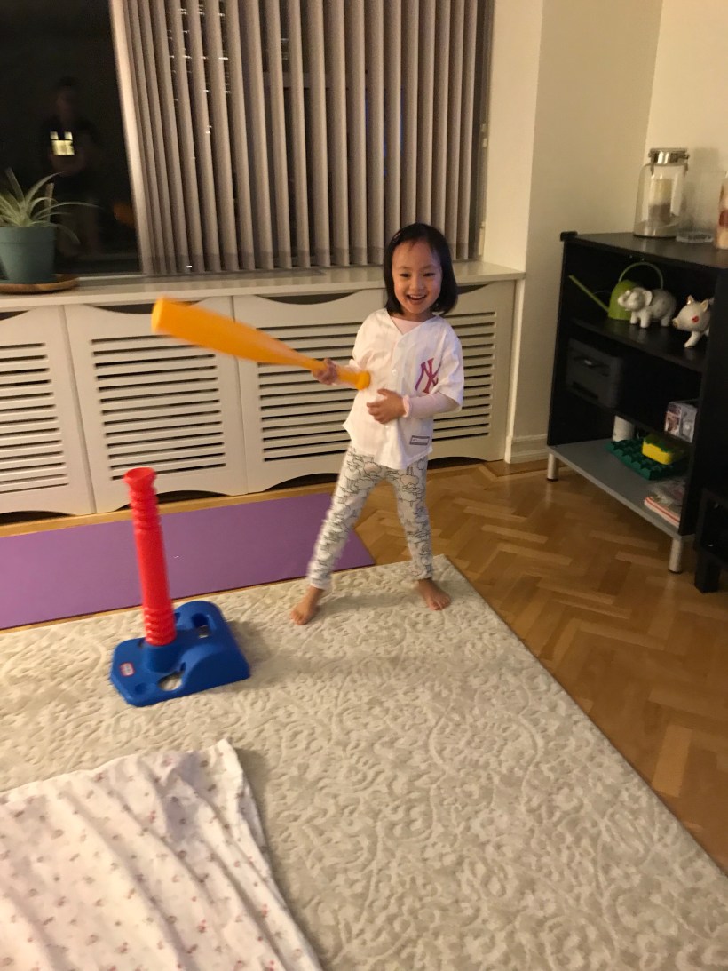 我們路上經過洋基紀念品專賣店,Chelsea 挑了一件粉紅條紋球衣,回家迫不及待地穿上,表演打棒球給阿公、阿嬤看。